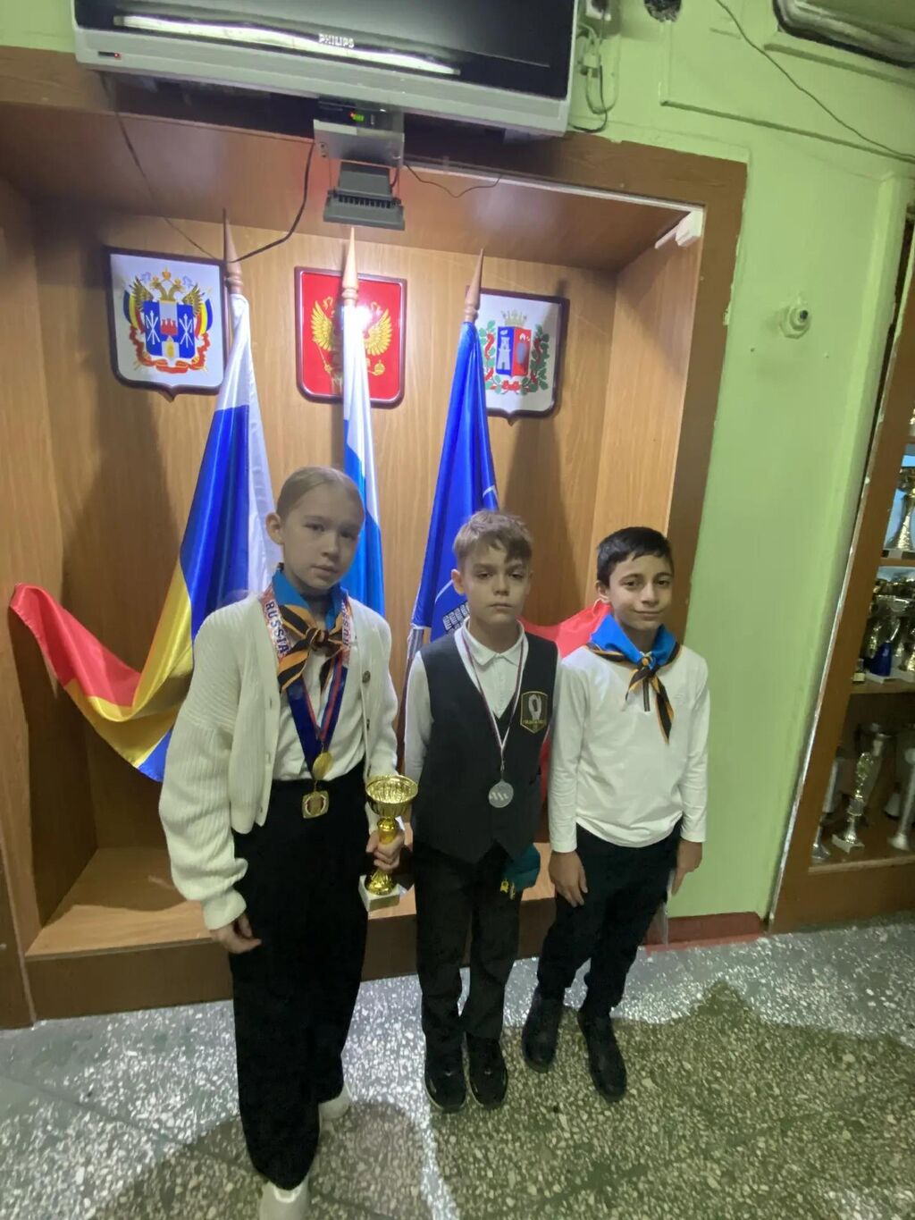 По сложившейся традиции гимназисты поздравили своих товарищей, добившихся побед на соревнованиях, смотрах и конкурсах. Юные гимназисты вышли с кубками, дипломами, грамотами, призами.
